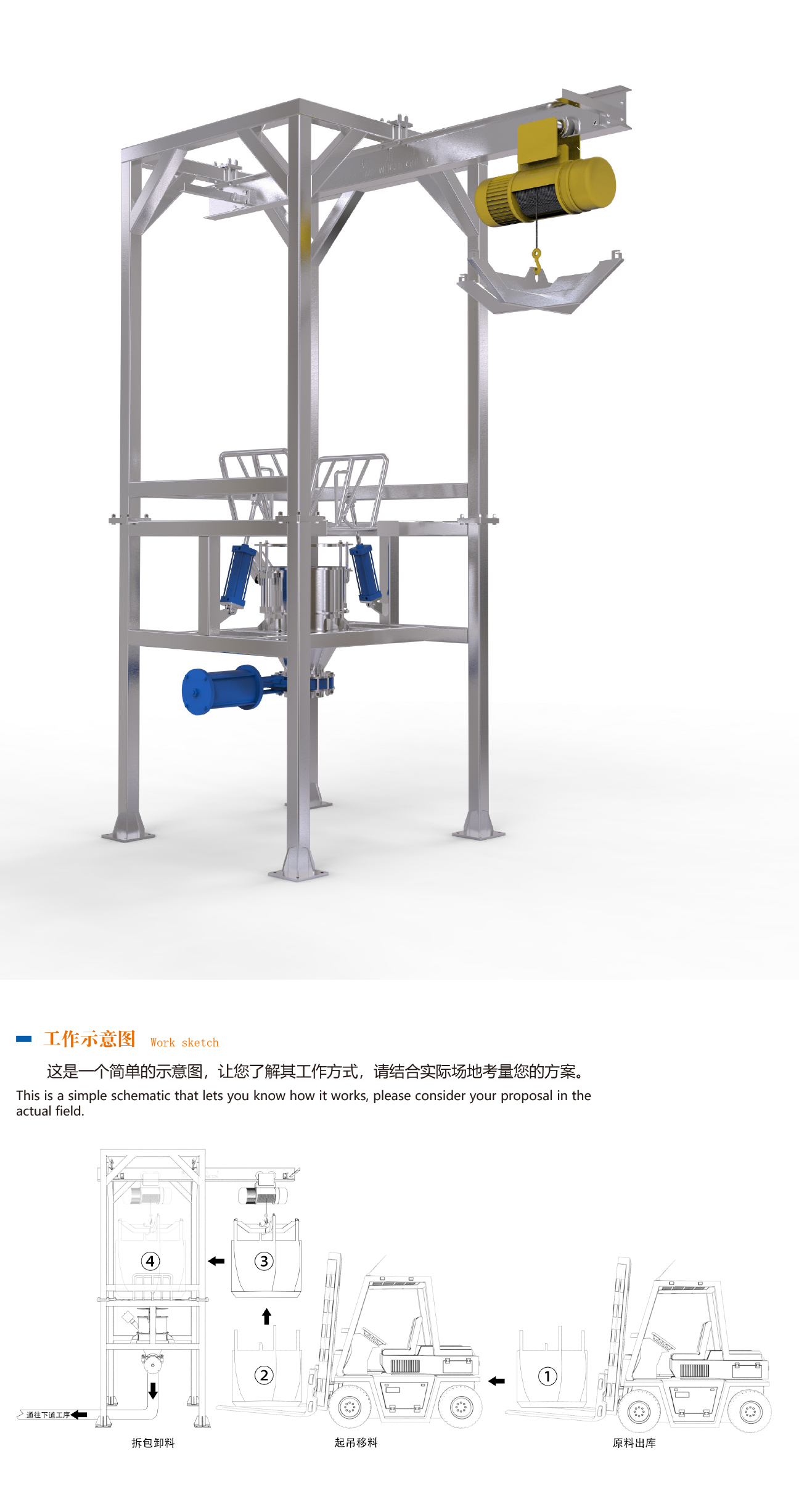 2、電動葫蘆;(也可用客戶自有的行車、叉車等起重設備)