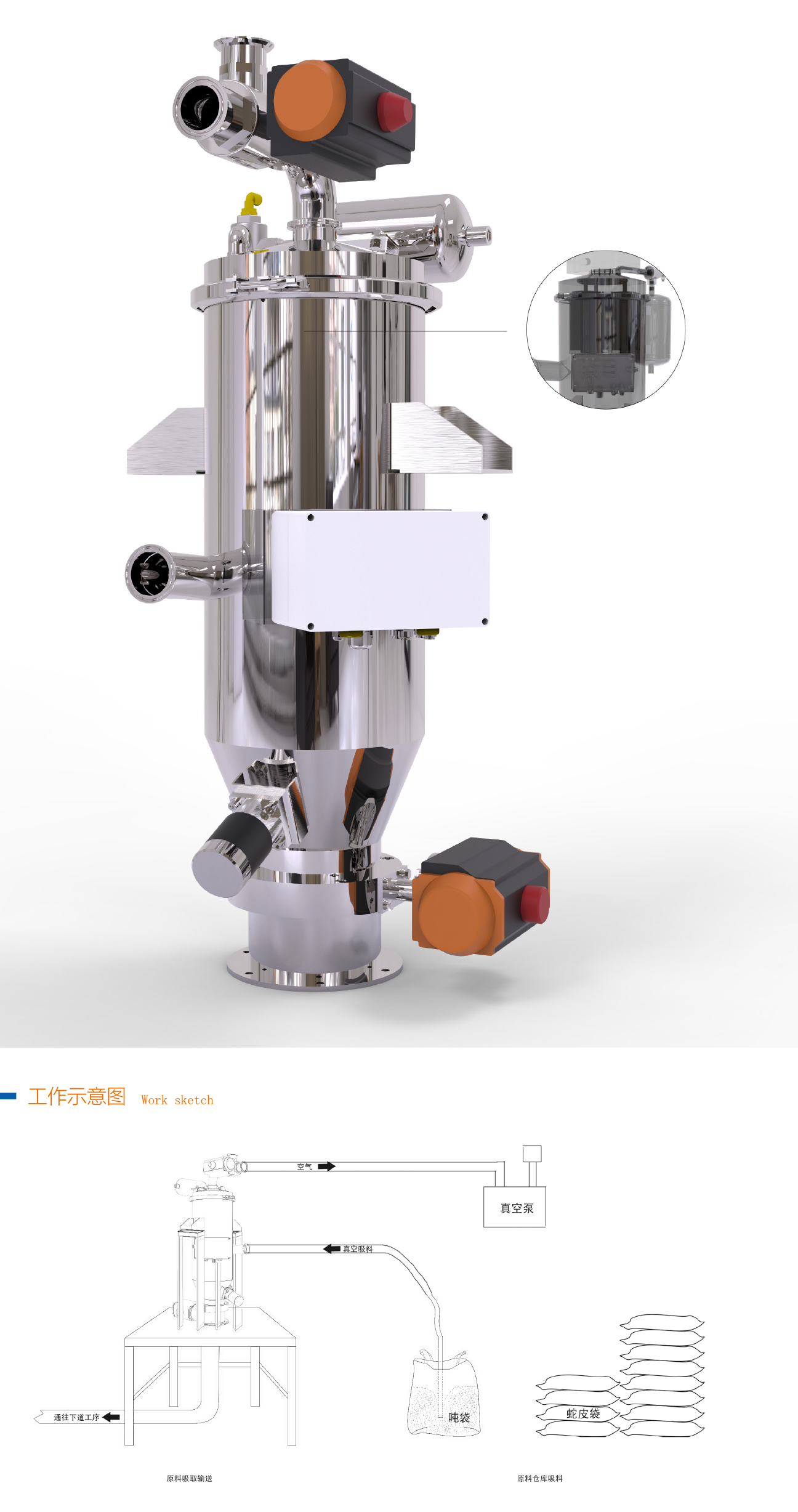 1、氣動控制器控制真空泵啟動,在分離倉內產生真空,迅速將空氣和物料從進料口經軟管或管子從吸料口進入到真空輸送設備中,從而達到輸送物料的目的。